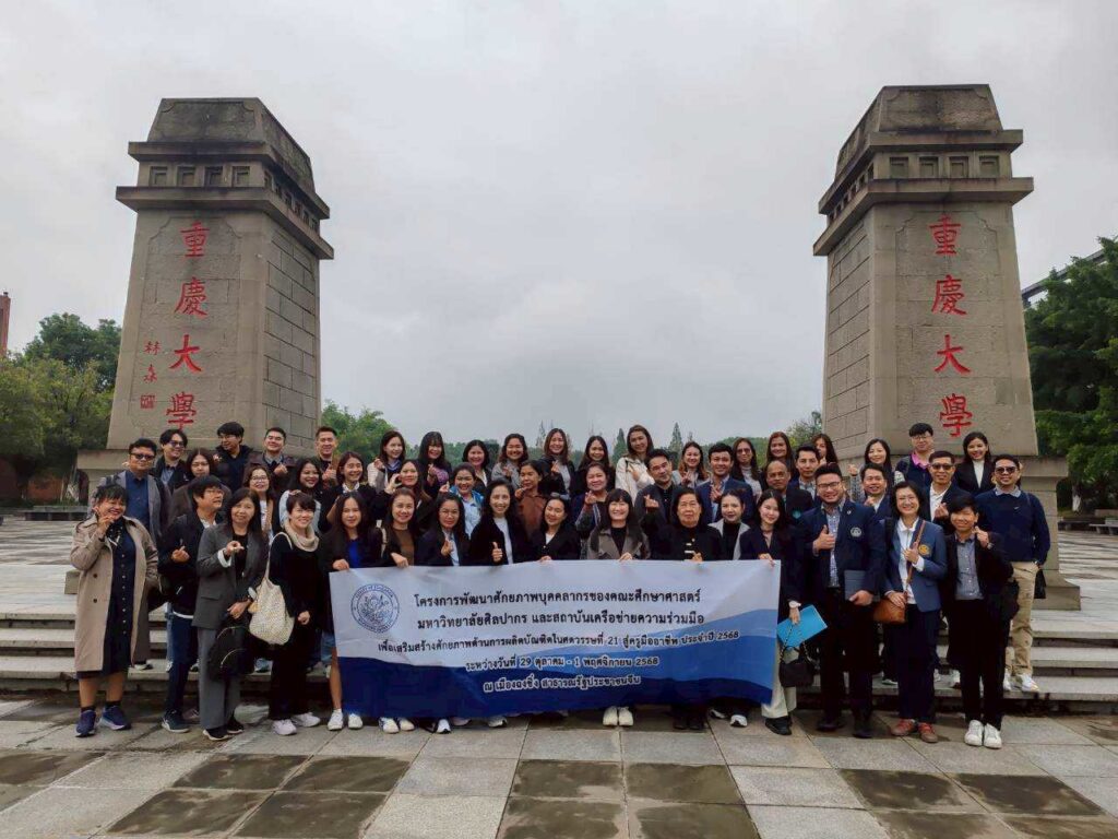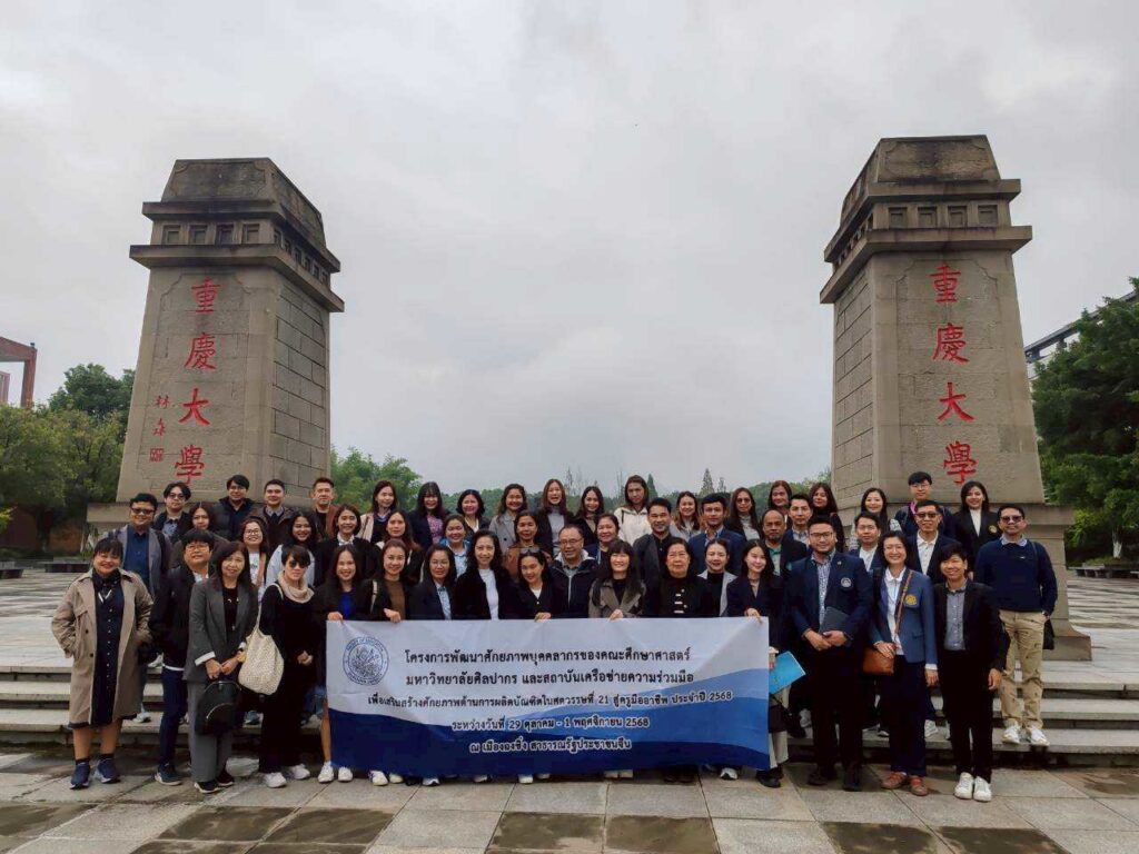 วันที่ 29 ตุลาคม – 1 พฤศจิกายน 2568 คณะศึกษาศาสตร์ มหาวิทยาลัยศิลปากร จัดโครงการพัฒนาศักยภาพบุคลากรของคณะศึกษาศาสตร์ และสถาบันเครือข่ายความร่วมมือ เพื่อเสริมสร้างศักยภาพด้านการผลิตบัณฑิตในศตวรรษที่ 21 สู่ครูมืออาชีพ ประจำปี 2568 ณ มหาวิทยาลัยฉงชิ่ง (Chongqing University) และโรงเรียนมัธยม Chongqing No.1 Middle School เมืองฉงชิ่ง สาธารณรัฐประชาชนจีน โดยมีคณะผู้บริหาร หัวหน้าภาควิชา ประธานสาขาวิชา อาจารย์ประจำหลักสูตร ครูพี่เลี้ยงโรงเรียนเครือข่ายและบุคลากรสายสนับสนุน เข้าร่วมโครงการ โดยมีวัตถุประสงค์เพื่อนำความรู้ประสบการณ์ที่ได้รับมาแลกเปลี่ยนเรียนรู้ระหว่างผู้ร่วมผลิตบัณฑิตวิชาชีพครู เพื่อพัฒนานวัตกรรมทางการศึกษาในการผลิตบัณฑิตมืออาชีพได้เปิดโลกทัศน์ใหม่และนำความรู้มาพัฒนาและปรับใช้กับหน่วยงาน